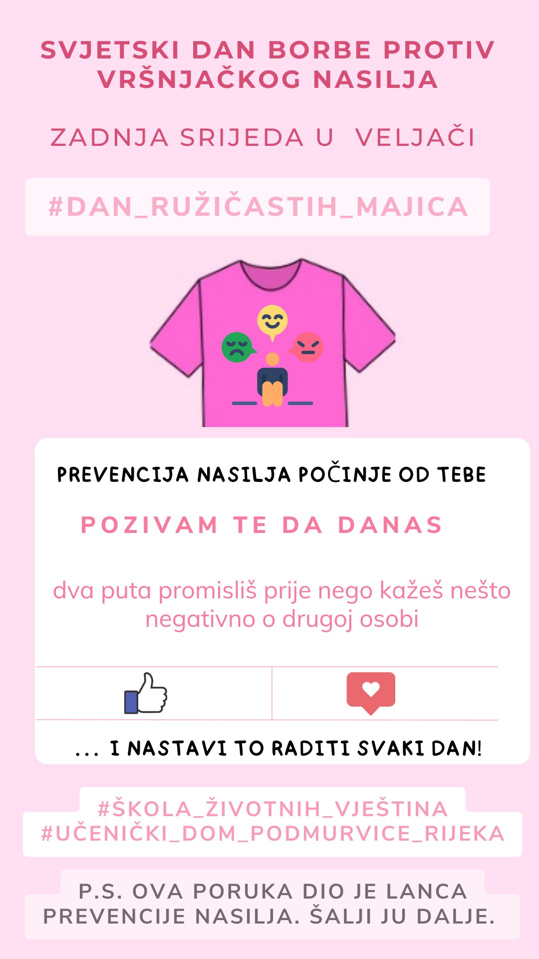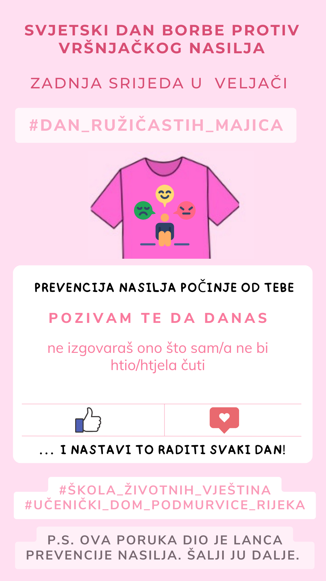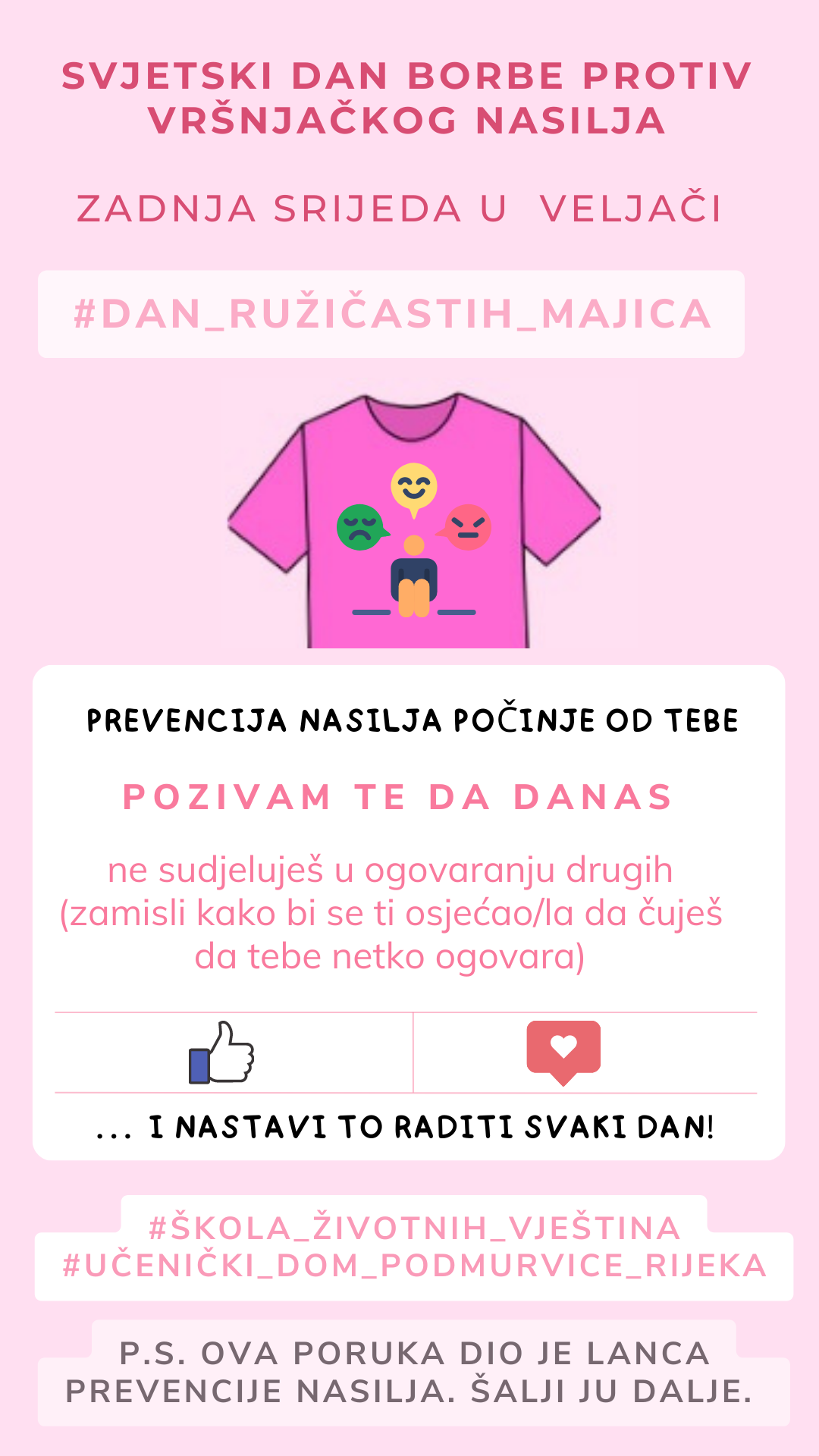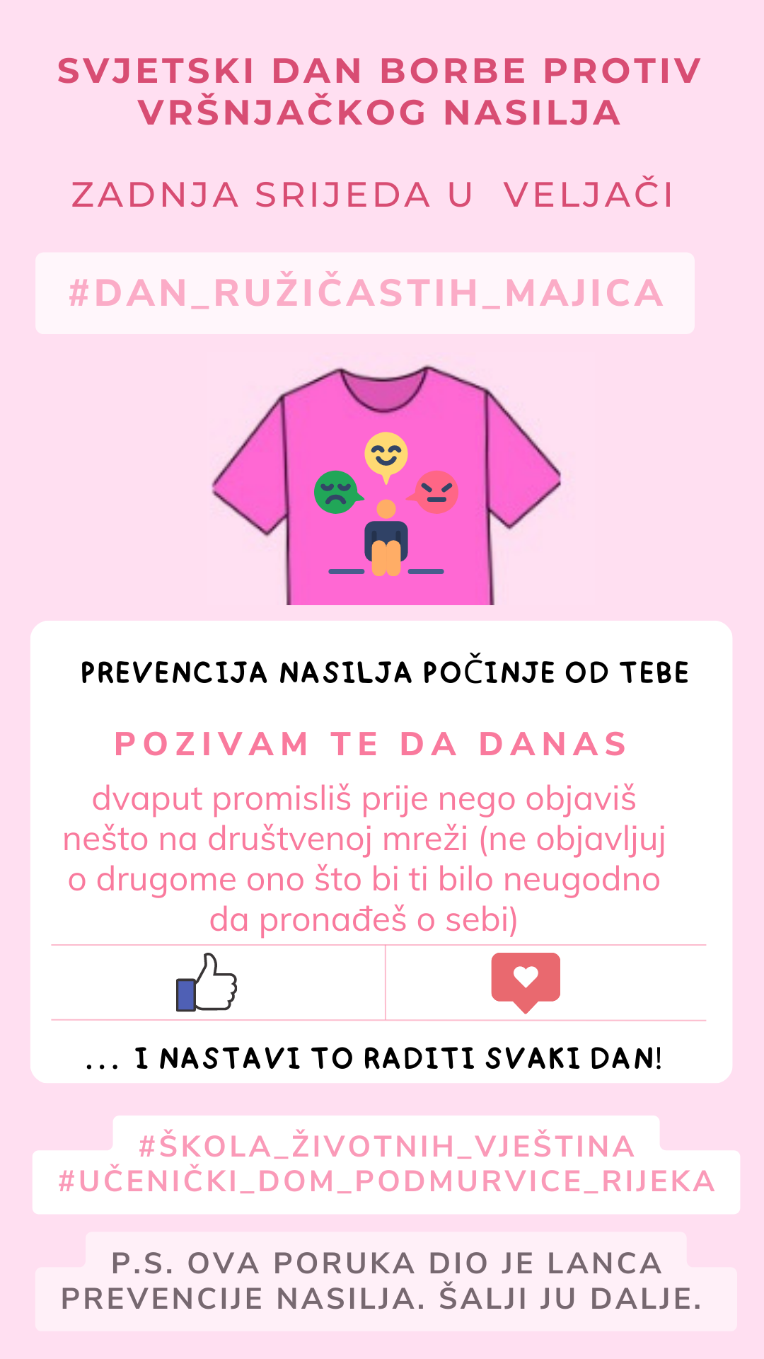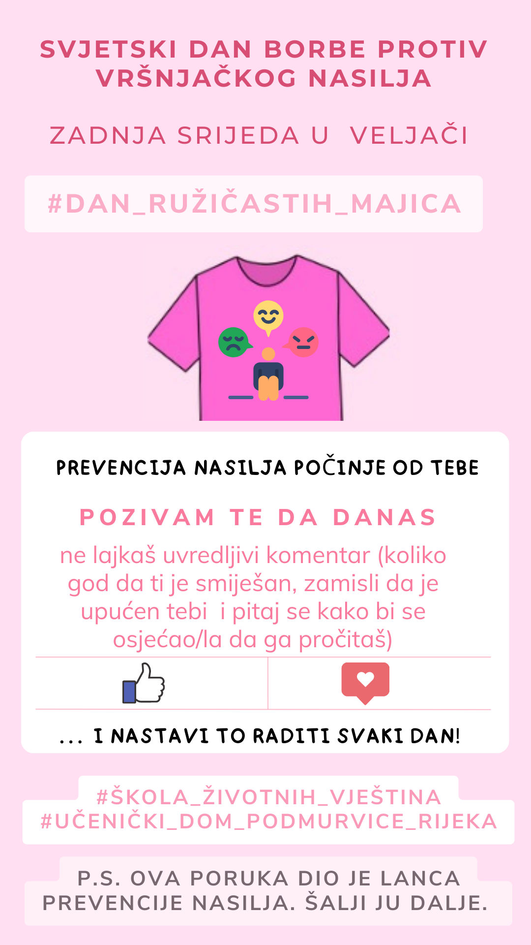 Zadnje srijede u veljači obilježava se Svjetski dan borbe protiv vršnjačkog nasilja, odnosno Dan ružičastih majica. Budući da su učenici tada na školskim praznicima, odlučili smo pokrenuti lanac prevencije nasilja koji će se širiti društvenim mrežama i aplikacijama za komunikaciju po uzoru na „lance sreće“.